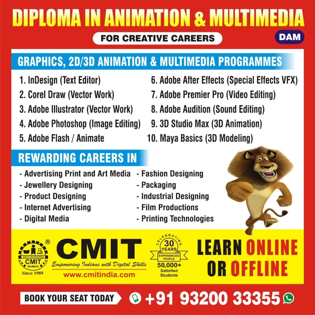 The Diploma in Animation & Multimedia at CMIT Institute is a hands-on program that covers computing fundamentals on Windows 11, core graphics and animation principles, and professional software tools — Adobe InDesign, Photoshop, Illustrator, Premiere Pro, After Effects, Animate, CorelDraw, plus sound editing and 3D tools (3D Studio Max, Maya basics). Graduates / Undergraduates leave with practical skills to produce 2D/3D animations, motion graphics and multimedia projects, ready for roles in animation, VFX, game and digital media industries.
