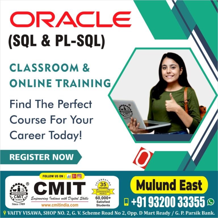 CMIT Institute’s Oracle Database – SQL + PL/SQL course teaches core SQL for querying and managing Oracle databases and advanced PL/SQL programming for building robust stored procedures, functions, packages, and triggers. Through hands-on labs and real-world projects you’ll master transaction control, performance tuning, exception handling, cursors and bulk processing — preparing you for Oracle development roles and certification.